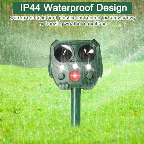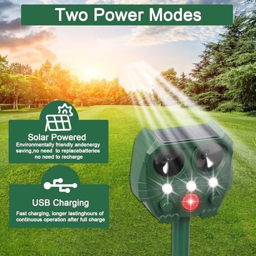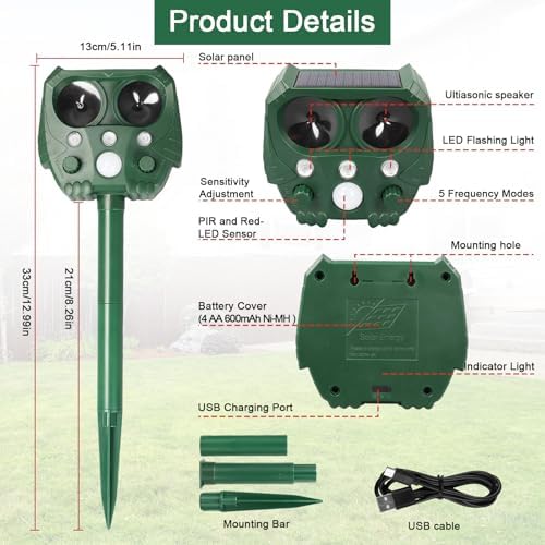 - Détection de Mouvement Haute Précision : Détecteur PIR à 110° pour repérer les animaux jusqu'à 10 m, activant des ultrasons puissants et une lumière LED clignotante.